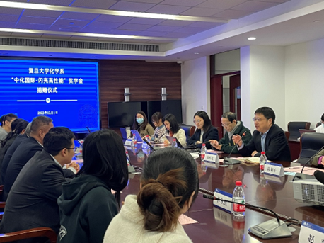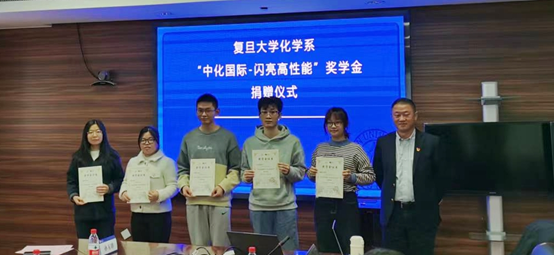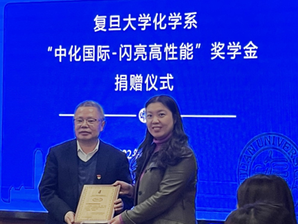 12月1日,成人直播 “中化国际-闪亮高性能”奖学金捐赠仪式暨颁奖仪式于江湾化学楼举行。中化国际高性能材料事业部党委书记、总经理余红涛,党委副书记、副总经理顾志强,人力资源部总经理张琨,党群工作部主任高明钰,党群工作部主管郝铁军,成人直播 对外发展与联络处副处长、上海成人直播 教育发展基金会副秘书长陆颖丰,成人直播 系主任周鸣飞,党委书记马蔚纯,党委副书记秦枫及获奖学生代表参加了仪式。