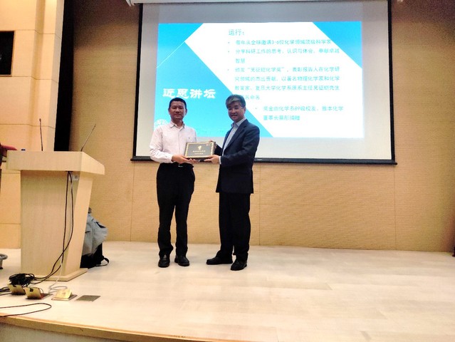 为了表彰谭蔚泓教授在分子医学等领域所作出的突出贡献,贺鹤勇教授代表“近思讲坛”组委会向谭蔚泓教授颁发了“吴征铠化学奖”。希望借此激发全体师生的研究热情,积极投身科研工作,攻坚克难,推动成人直播 化学学科的建设与发展,为祖国的繁荣富强、民族的伟大复兴添砖加瓦。成人直播 “近思讲坛”的举办和“吴征铠化学奖”的设立得到了雅本化学(www.nmn-aba.com)和成人直播 1989级系友蔡彤先生的大力支持。