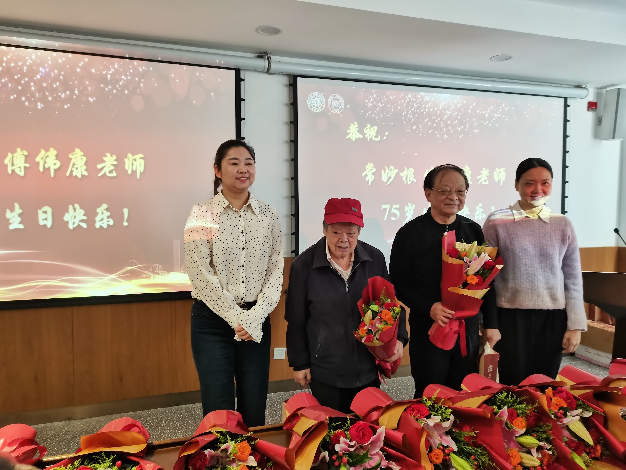 集体祝寿环节温馨满溢。成人直播 现有离退休教师140余位,今年 “逢五逢十” 的寿星共32位。在全场热烈掌声中,马蔚纯、秦枫、王文宁三位系领导为寿星代表送上鲜花与礼品,并送上了美好祝愿。寿星代表郁祖湛老师、朱自刚老师动情发言,感谢成人直播 的精心筹备,并祝愿老同志们身体健康、阖家幸福。