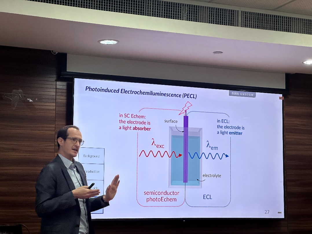 Gabriel Loget教授主要从事半导体电极上的光电化学研究,该过程包括了光子吸收和电化学的电荷转移两个方面,当这两种刺激同时在固/液界面出现时,能够以更低电压即更低能量输入触发电化学反应。他分享了这种现象在太阳能燃料等方面的系列成果,例如水分解或二氧化碳还原。然后Gabriel Loget教授详细介绍了他们团队在制备和应用硅基光阳极方面的工作,特别是尿素氧化反应(UOR)的最新进展。此外,Gabriel Loget教授团队将光阳极与电化学发光相结合,实现了光致电化学发光(PECL),并最终实现全光学发光(AO-ECL)。