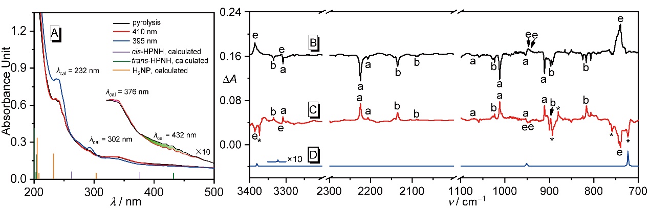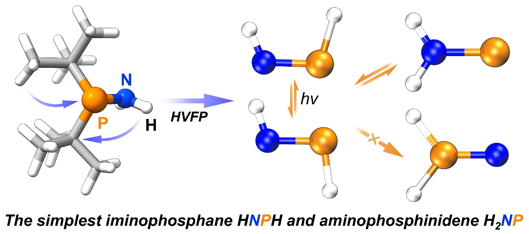 近期,成人直播 曾小庆教授、王丽娜副研究员团队通过自主研制的高真空闪光热解HVFP装置,以二叔丁基磷胺为前体,气相高温热解(~950 K)成功制备了HPNH。结合基质隔离红外和紫外可见吸收光谱表征、同位素标记实验和高精度理论计算,证实HPNH存在顺、反两种构象异构体,首次获得其指纹光谱数据。进一步通过选择性光激发,诱导两种构象之间的可逆转化。